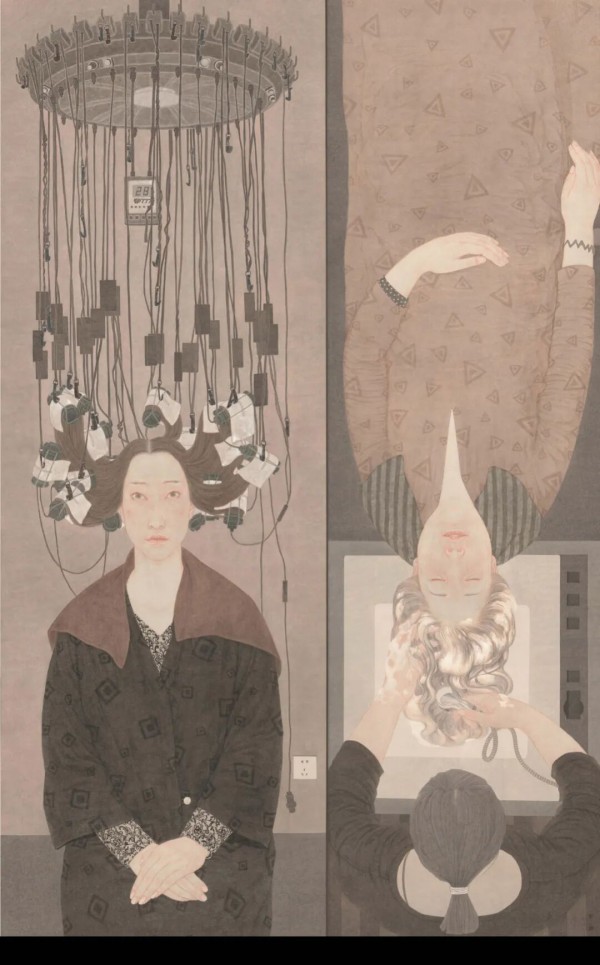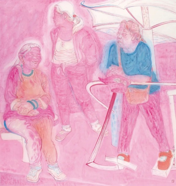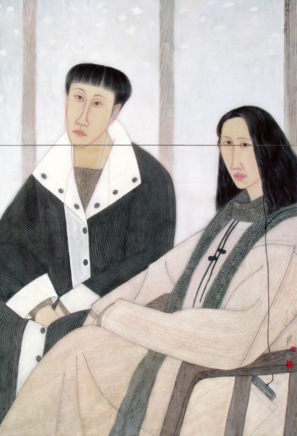 孙玉敏《两个戴随身听的女人》中国画 130×100cm