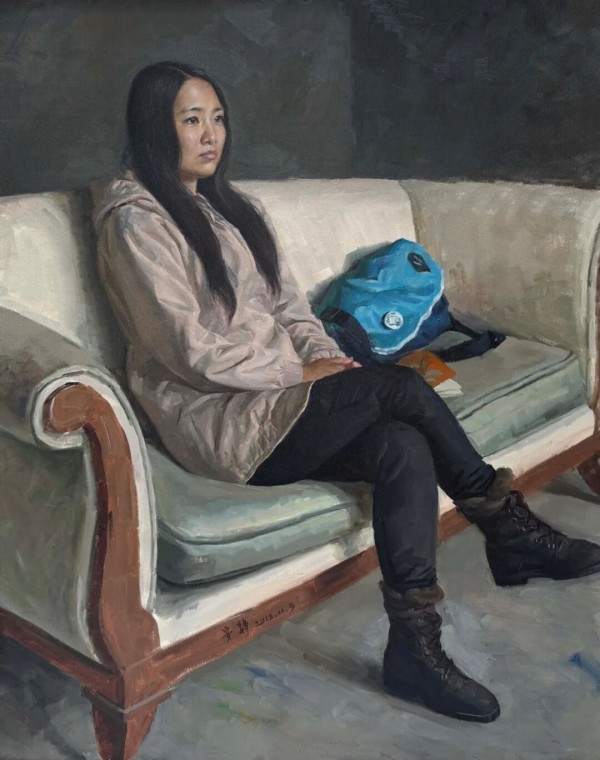 安静《蓝书包》油画 100x80cm