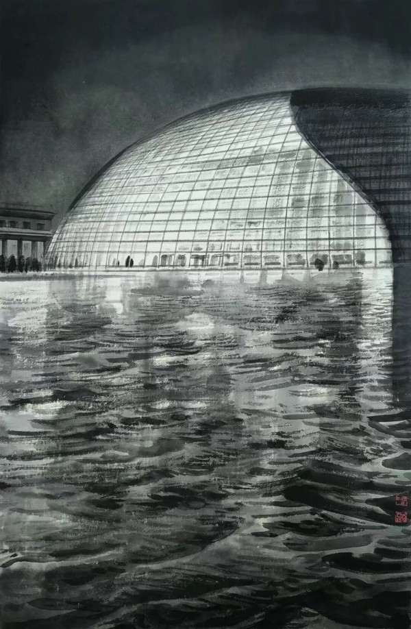 在北京工作生活二十余载,冯远深深爱上了这座历史底蕴厚重又澎湃着现代气息的城市。他将“古都纪景”放在展览的第一个板块,着力以中国画笔墨诠释都市风貌,与寄情草木山川的第四板块“天地有情”形成呼应。最新创作的“老北京烟火人家”系列,有意识地记录了老北京丰厚文脉中普通民众的生活情态,充满民俗意趣与情感温度。“圣都纪景”系列则聚焦“城市山水”。在他的眼中,城市中鳞次栉比、拔地而起的建筑,可视为耸立的“山”;那川流不息的街道脉络,便是流动的“河”。他并未着眼于中轴线上宏大的建筑群,而是撷取局部与侧面,描绘北京城现代建筑与传统院落交织的图景。他深信,随着中国城市化进程的飞速发展,现代都市景观必将成为中国画重要的表现题材,尤其是“城市山水”,作为中国山水画转型期的时代课题,终将成为山水画新传统的一部分。正是在创作实践中,冯远感受到了技法上的挑战——描绘现代建筑形态时,传统笔墨语汇已显不足,时常需要运用爽利、平直的线条来表现现代都市特有的速度感与质量感。他意识到,必须创造一套山水画新技法。