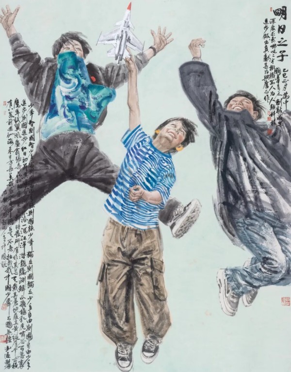 “人是作品的第一要义”是冯远始终坚持的创作理念。“浮生写心”板块,他聚焦华夏各族儿女,通过质朴生动的形象塑造,书写着生命的本真状态,汇聚多年深入生活、写生创作的部分成果。于最短时间内准确捕捉、表现人物形神,对人物画家而言,是根基,亦是关键。但传统人物画技法,在表现当代人,尤其是现代化建设的劳动者时,同样令创作者感到力有不逮。这倒逼着创作者不断锤炼观察、表现现实生活的能力。《明日之子》这件新作,源于冯远在乙巳春节前后的真情实感。深度求索等公司的年轻团队取得举世瞩目的科研成果,令他振奋不已,萌生造像之念。他并没有绘制青年科学家的肖像,而是构思先行,采用象征手法,描绘一名青少年仰首放飞模型飞机,其身后两位伙伴欢呼雀跃。梁启超《少年中国说》中的文字作为题跋,与人物相组合,寄寓“青年的理想信念关乎国家未来”之思。