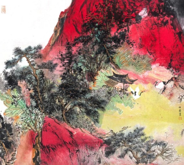 任赛《丹霞鹤影》纸本设色