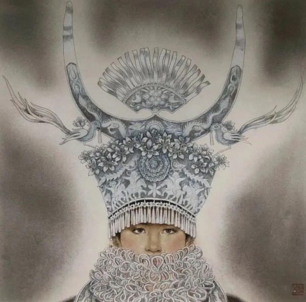 蒋采苹《戴银冠的苗女》纸本,67×67cm,1999年