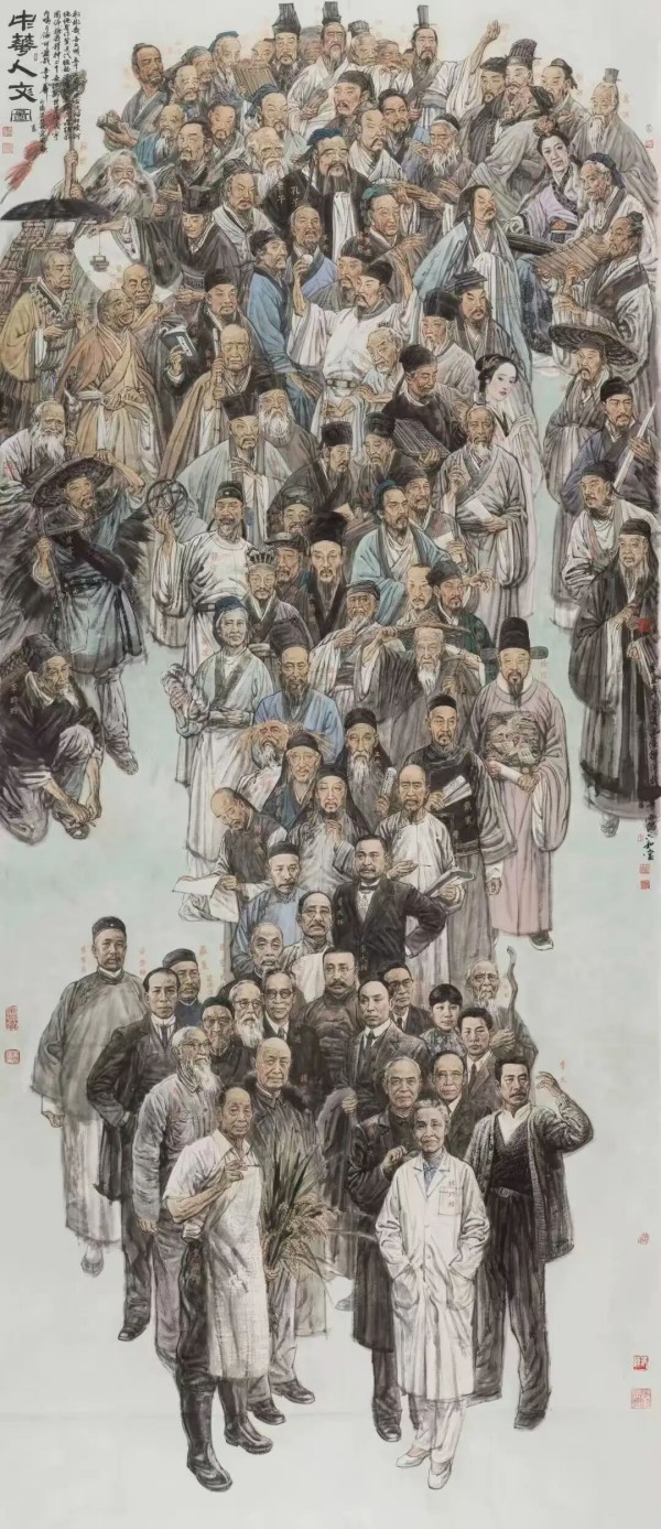 作为一名偏爱历史的学者型画家,冯远常醉心阅读文史哲类书籍。“先贤遗音”板块,便是他于历史深处聆听到的回响。中华文明五千年,有许许多多可歌可泣的重大事件与重要人物值得描绘,然而中国美术史中,此类题材却相对少见。崇尚汉唐雄风的冯远,深感个体情志的抒发与宏大叙事题材之间,并非截然对立,但中国画尤其是文人画传统中缺少这份炽热情怀。自1980年创作《秦隶筑城图》以来,他不断以大型史诗性作品表达对历史的多维认知,近年来更是创作了《中华人文图》等一批巨作。在这类多人物组合的创作中,他并未刻意追求个人风格。他的首要目的,是将那些存于想象中或有详实史料可考的历史人物,尽可能精准、生动地再现于画面。当闪耀于中华文明史册的伟人组合起来构成宏大的历史场景,观者无不为之心潮澎湃。