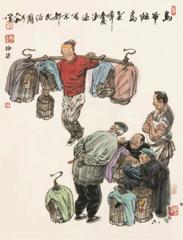 中国画《老北京烟火人家之鸟爷炫鸟》,作者冯远。