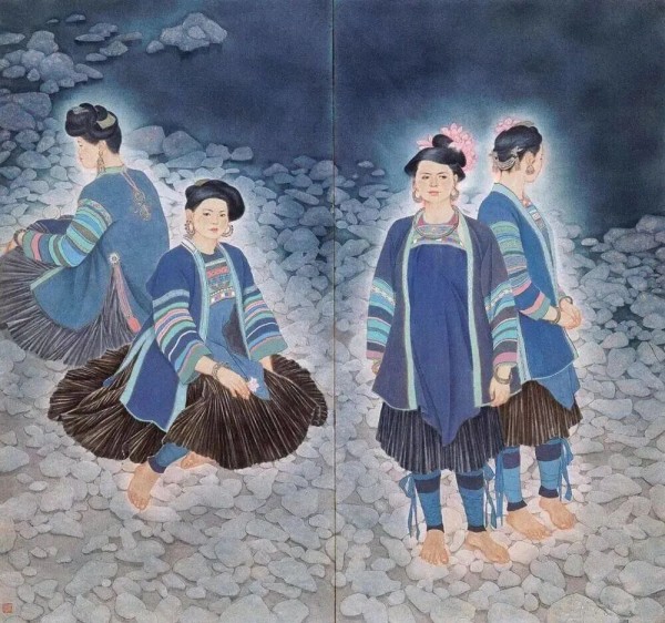 蒋采苹《三月三之夜(二联画)》工笔重彩,90×180cm×2,1988年