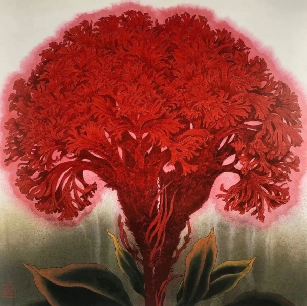 蒋采苹《并蒂鸡冠花》纸本,67×67cm,1995年