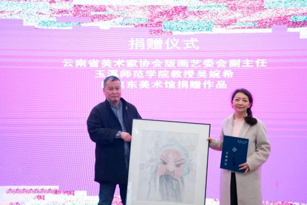 云南省美术家协会版画艺委会副主任、玉溪师范学院教授吴婉希向启东美术馆捐赠作品启东美术馆馆长章水雄接收作品并颁发证书